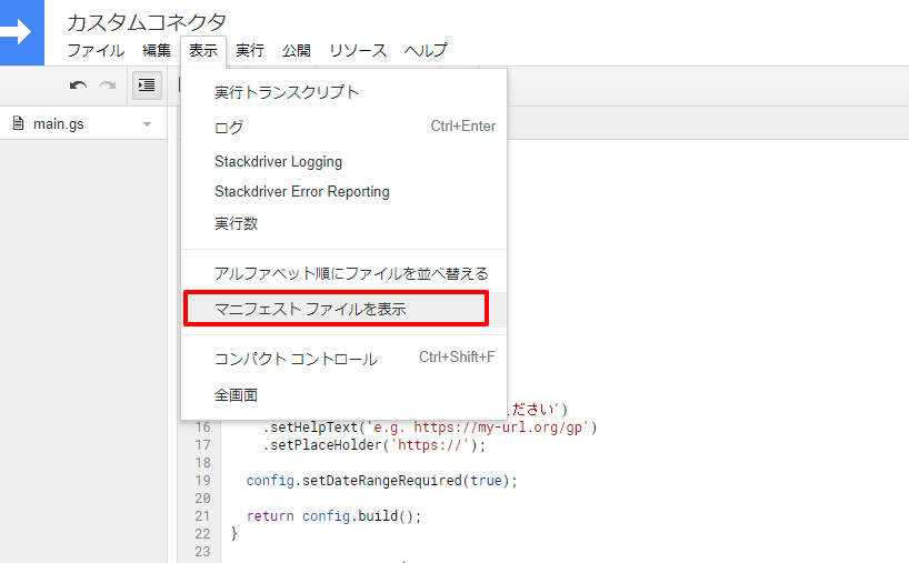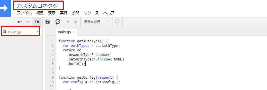 そこで、まず「無題のプロジェクト」を「カスタムコネクタ」と上書きし、「コード.gs」を「main.gs」と英語名に改名します。英語名にするのは、後にウェブ環境以外で編集するときに扱い易くするためです。main.gsでなくてもCode.gsでも名前はOKです。ただし、拡張子は、jsでなくgsであることに注意を。