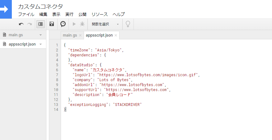 マニフェストファイル、appsscript.jsonは、作成したコネクタをコミュニティコネクタとして登録するのに必要な情報を含みます。以下は私のビジネスの例。