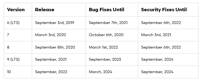 残念ながらバージョン7.xはLTS(長期サポート)ではありません。以下に見ての通りに来月でサポートが切れてしまいます。前バージョンの6.xの方がLTSサポートなのでサポート終了はまだ先です。