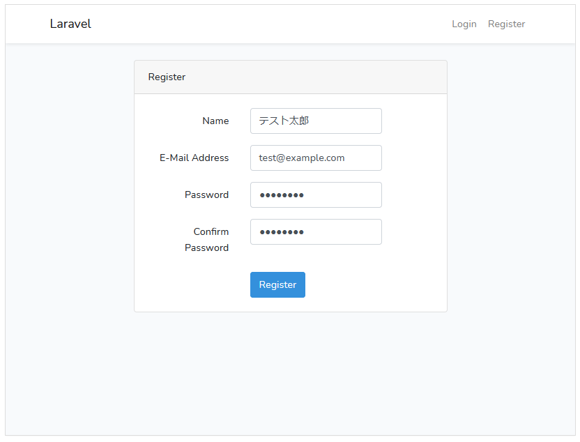 再度、ブラウザでhttp://localhost:8000/registerにアクセスします。
