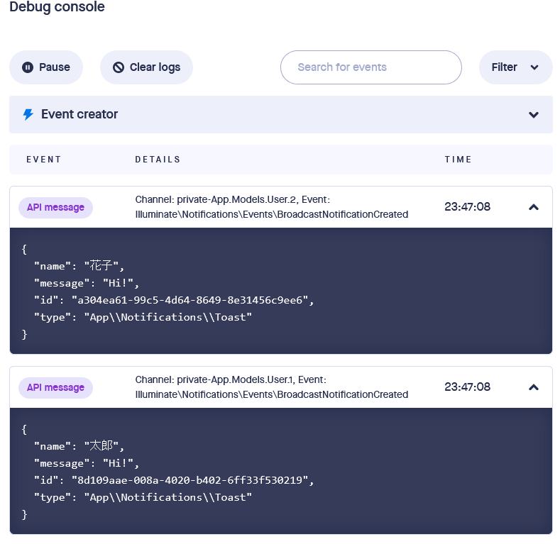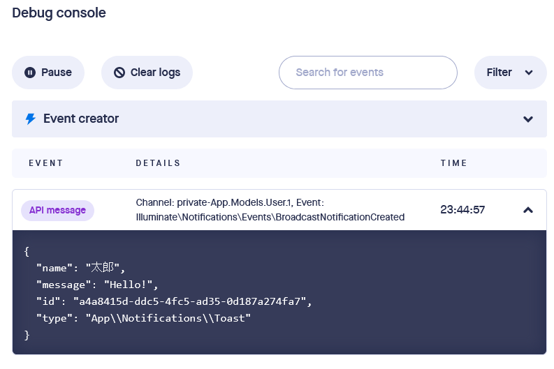 以下は、その直後のPusherのDebug Consoleでの画面です。Pusher側では、チャンネル名は private-App.Models.User.1となっていて、イベントは、Illuminate\Notifications\Events\BroadcastNotificationCreatedとLaravelのイベントとなっていますね。