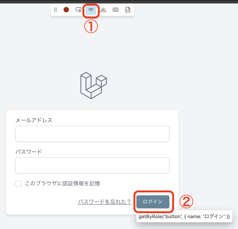 ①目のアイコンをクリックし、②確認対象の要素(ログインボタン)をクリックします。