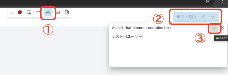 ①”ab”アイコンをクリックし、②確認対象の要素(アカウント名)をクリックします。すると以下のように入力ボックスが表示されるので、テスト用の文字列を変更したい場合はこちらで修正が可能です。問題なければ③のチェックマークをクリック。