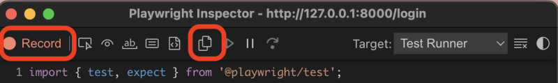 テストコードをひととおり作成したら、インスペクタの赤丸ボタンをクリックして記録を停止させます。コピーボタンでコードをコピーしたら、あとはエディタに貼り付けて修正を行います。