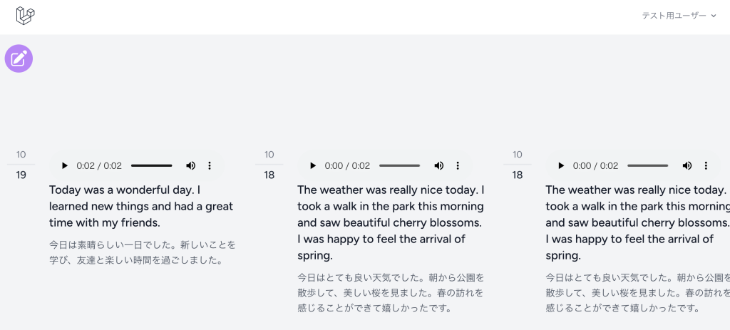 テスト対象のサイトについて簡単にご紹介します。よくある「英語日記」のような機能で、ログイン後のダッシュボードでは日記一覧の表示・音声再生・詳細画面への遷移ができます。