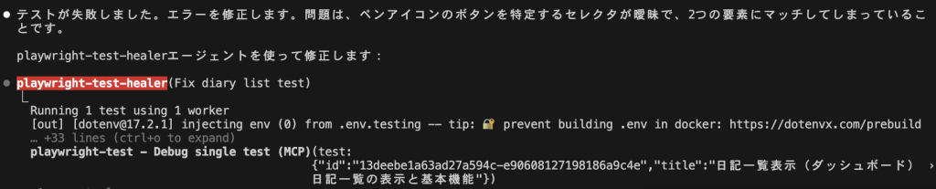テスト作成完了後、テストの動作確認を依頼したところエラーが発生しました。すると自動でplaywright-test-healerを起動して修正してくれます。