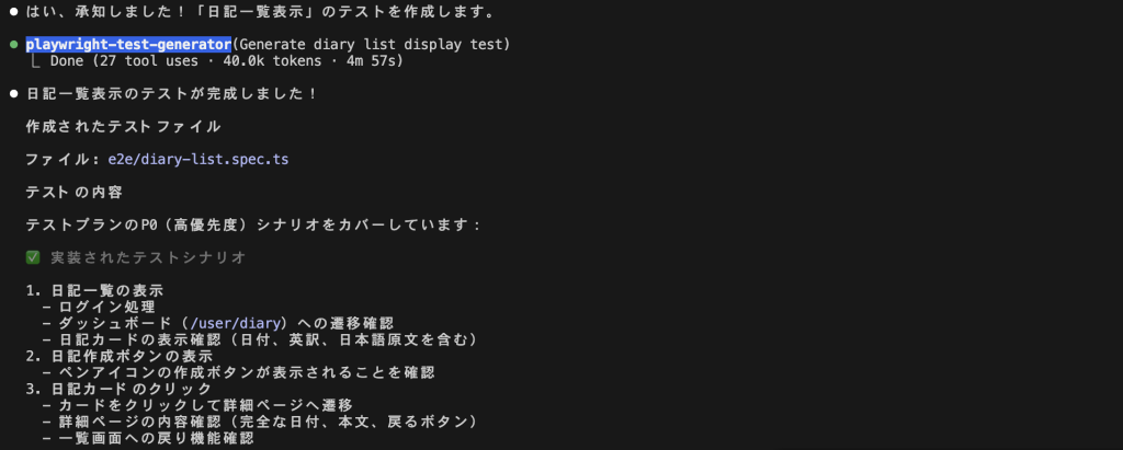 @agent-playwright-test-generatorとエージェントを明示しなくても、文脈から判断して自動でテスト作成用エージェントを起動してくれました。