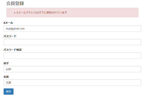 - すでに登録した会員のEメールを入れたときにエラーとなるか(重複チェック)。