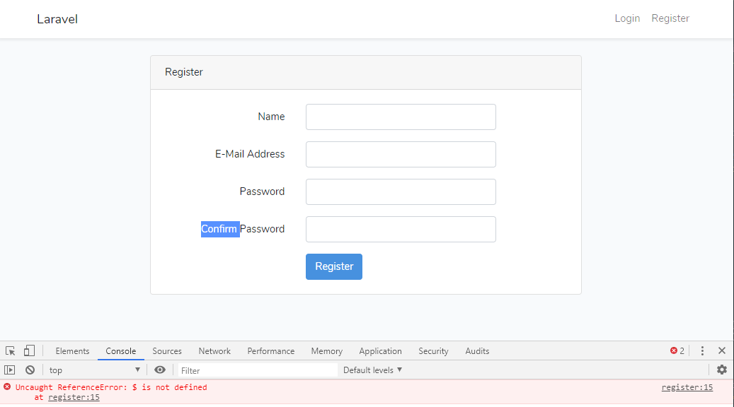 として実行してみると、以下のようなエラーとなってしまいます。せっかく埋めたjavascriptが効いていなく、画面の「Register」ボタンも無効表示ではなくアクセス可能となっています。