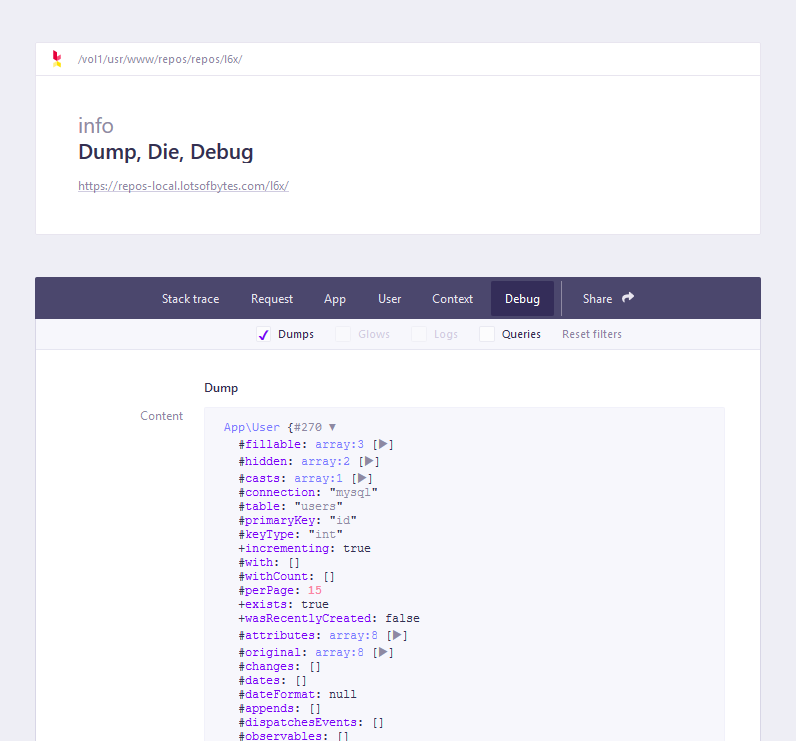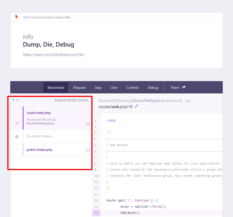 そればかりでなく、関数スタックのトレースもメニューを選択して表示してくれます。しかも、Laravel内部での関数の実行を隠して(拡張して見ることも可能)開発した関数だけを見せてくれます。