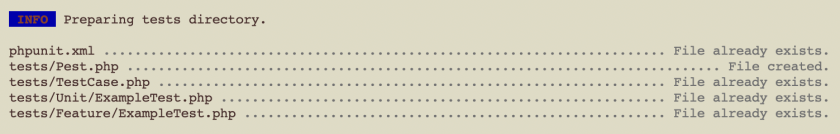 すると以下のファイルが作成されました。すでに存在しているファイルはパスされるので、実質Pest.phpのみが作成された形です。