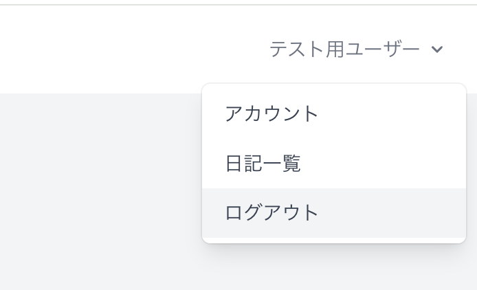 ユーザー名をクリックするとドロップダウンが開きます。テストでは、ドロップダウンの中にある「ログアウト」をクリックし、ログアウトが成功してhttp://127.0.0.1:8000/loginへ遷移する、という一連の動作をテストします。