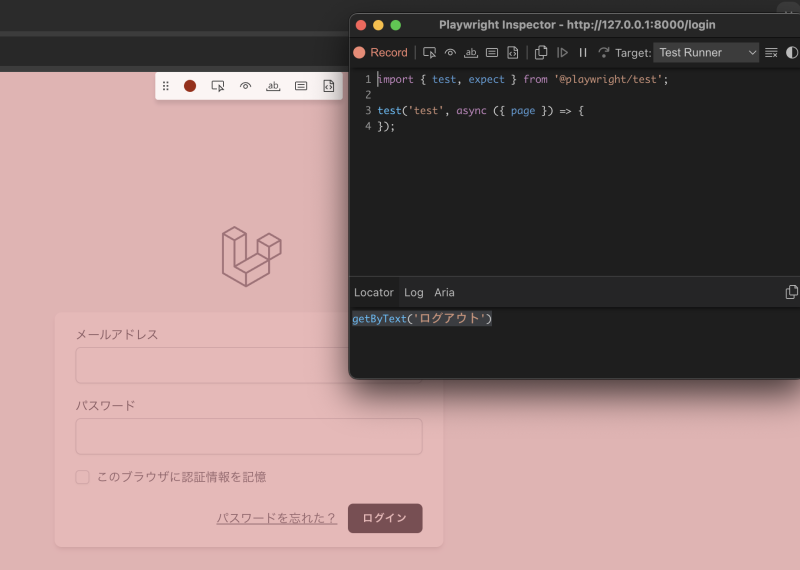コマンドを実行すると、ブラウザとPlaywrightインスペクターウィンドウが立ち上がりました。