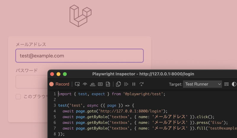 この状態から実際にブラウザを操作してテスト対象の動作を行うことで、テストコードが生成されてゆきます。例えば、メールアドレス入力欄に”test@example.com”と入力してみると、インスペクターの方にもコードが出力されます。