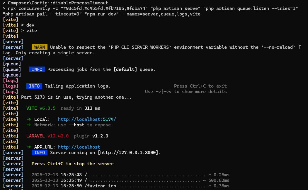 "start": "concurrently -c \"#93c5fd,#c4b5fd,#fb7185,#fdba74\" \"php artisan serve\" \"php artisan queue:listen --tries=1\" \"php artisan pail --timeout=0\" \"npm run dev\" --names=server,queue,logs,vite"